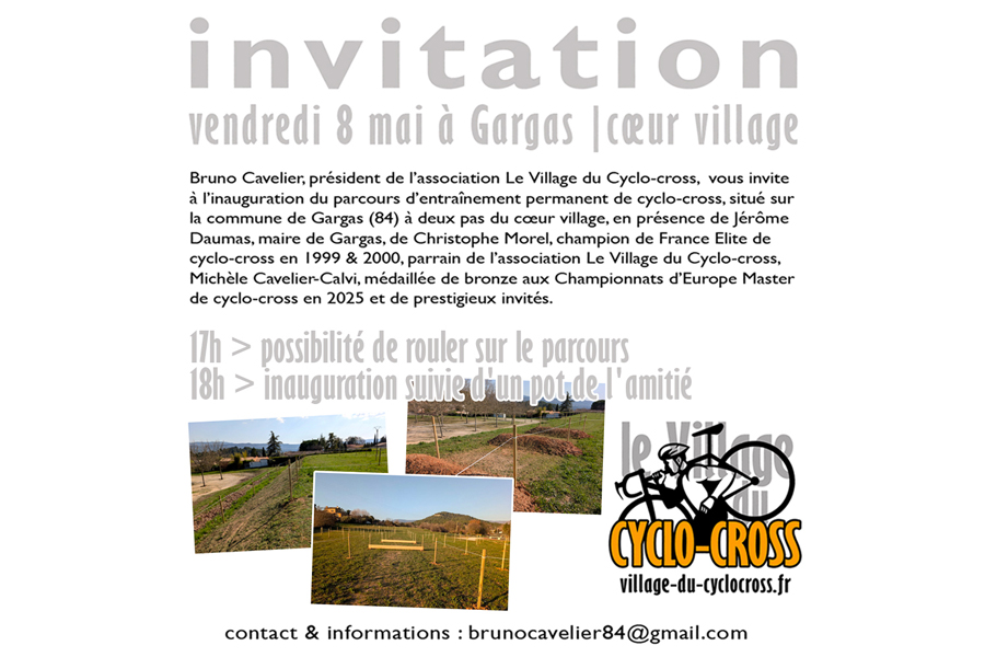 Tous les amoureux de cyclo-cross sont invités à l’inauguration officielle du parcours d’entraînement permanant à Gargas, le vendredi 8 mai 2026 à 17h, pour tester le parcours, puis à 18h pour l’inauguration officielle, en présence de Jérôme DAUMAS, maire de la commune. Notre parrain Christophe MOREL, double champion de France Elite de cyclo-cross (1999 et 2000) sera également présent, ainsi que les anciens cyclistes professionnels, Jean-Claude BAGOT et Léonardo DUQUE. Un pot de l’amitié sera offert sur place à l’issue de l’inauguration. Rendez-vous sur le parcours, derrière la place cœur village !